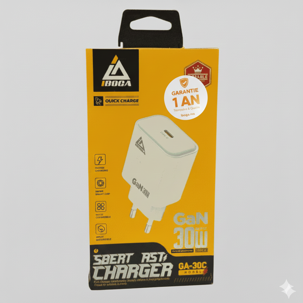Le chargeur GaN 30W IBOGA est conçu pour offrir une recharge ultra-rapide et efficace. Grâce à la technologie GaN, il délivre une puissance stable de 30W via son port USB-C, tout en garantissant une meilleure gestion de la chaleur et une sécurité optimale.