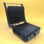 Le visuel met en avant un grill à ouverture large, idéal pour cuire différents types d’aliments : viandes, brochettes, légumes ou sandwichs grillés. Les plaques nervurées visibles permettent une cuisson marquée et appétissante, avec de belles stries de grill qui donnent immédiatement envie de passer à table.